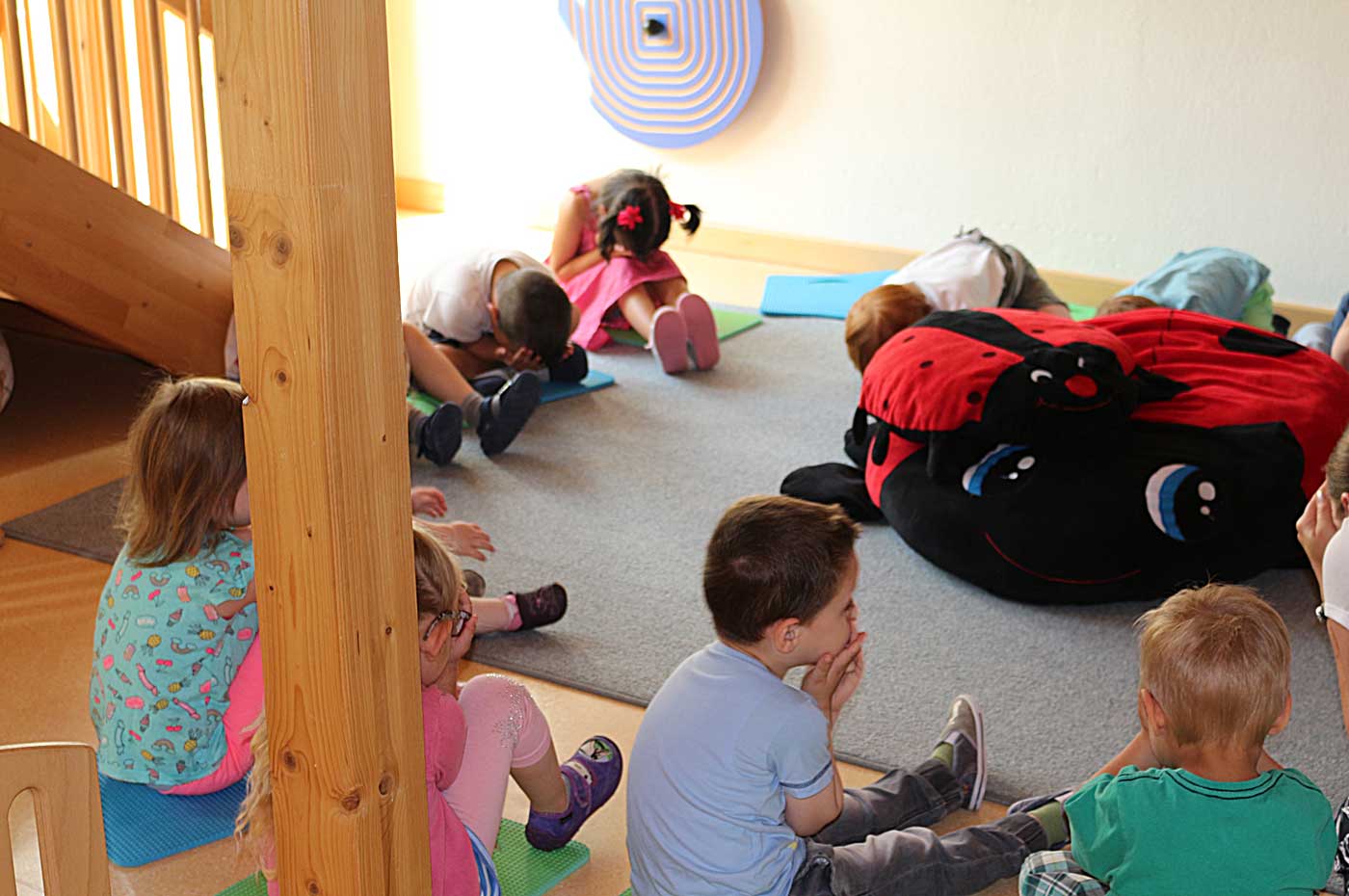 Außerdem schaffen wir Lernräume durch wiederkehrende Aktivitäten im Tages- und Wochenablauf, wie z.B. Sitzkreise, Gruppenarbeit, Turnstunden und Sprachförderung. Um das Gelernte verarbeiten zu können geben wir den Kindern Zeit, bieten Gesprächsanlässe, schaffen Rückzugsmöglichkeiten und haben immer ein offenes Ohr.